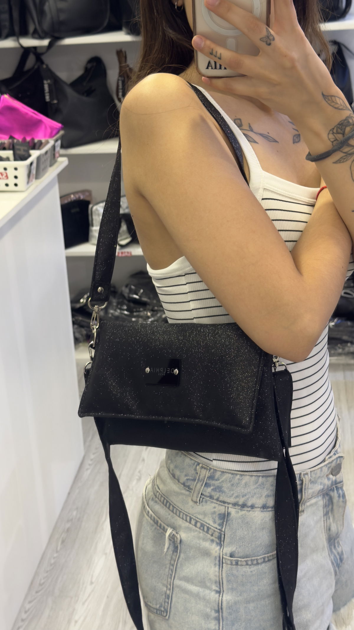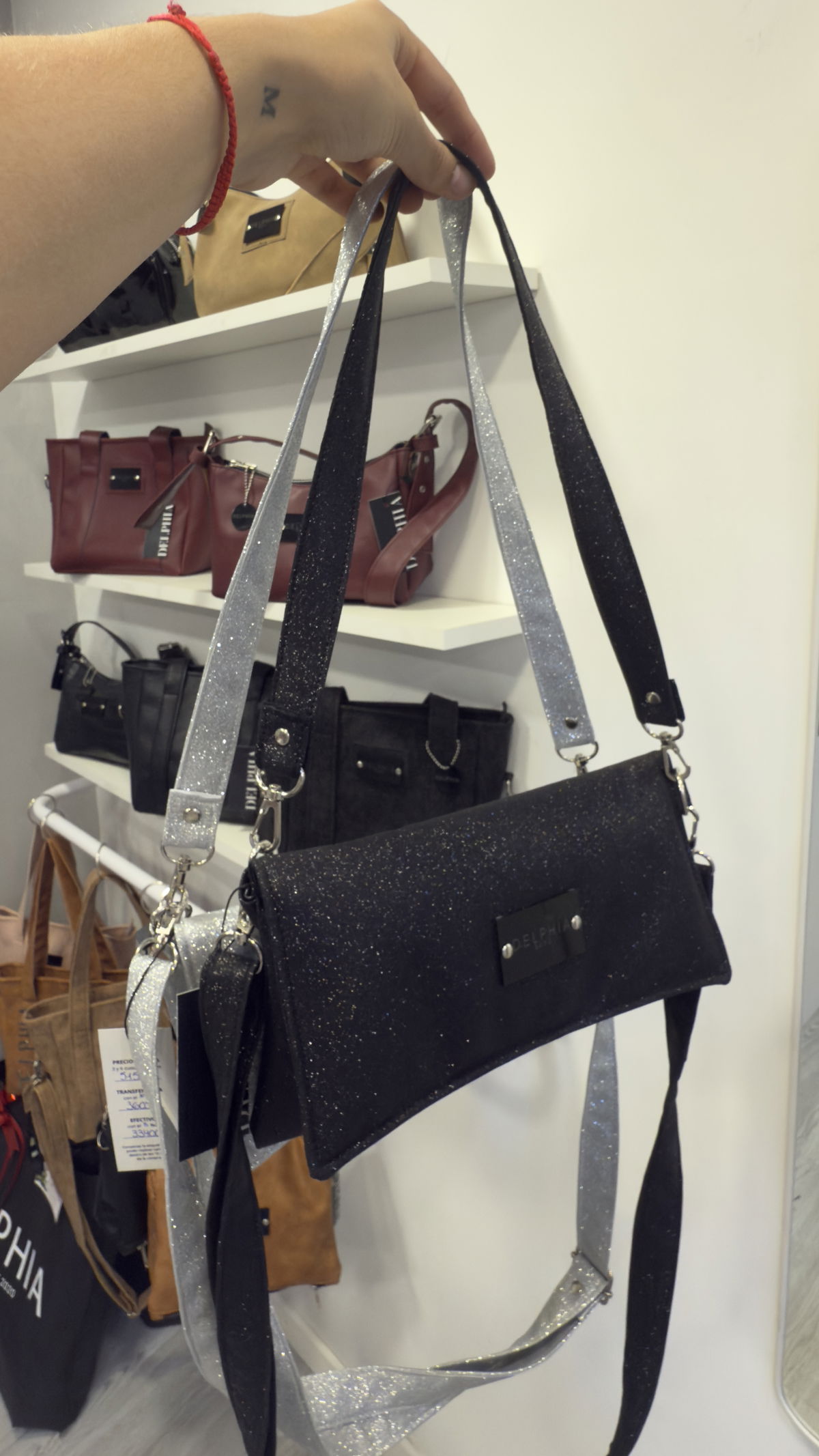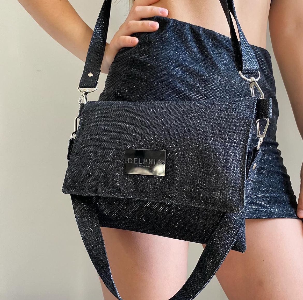 Mini acolchonada de brillos. Dos correas, una corta y una larga.
