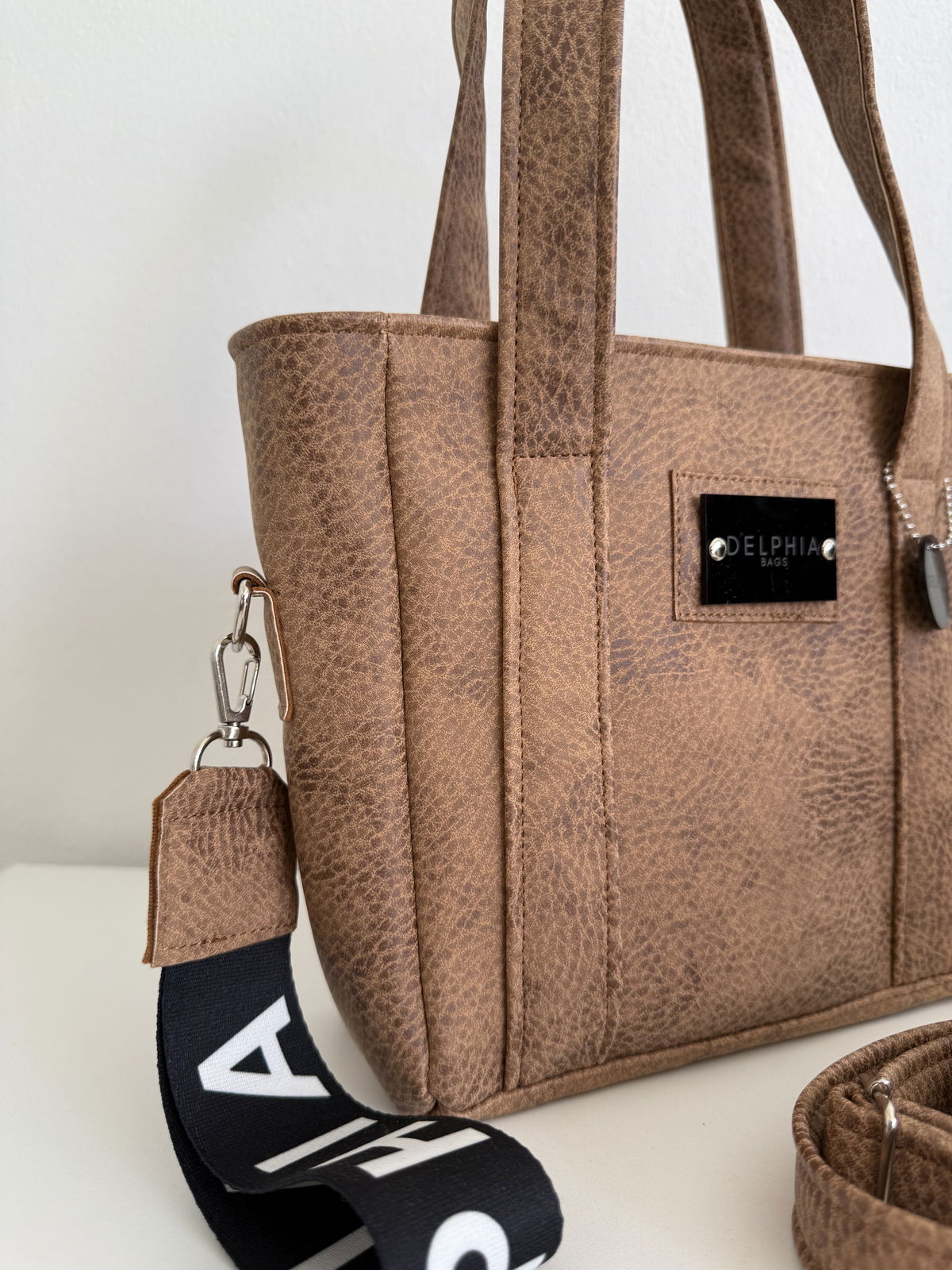 Mini tote suela gastado. Forrada en gross. Cuenta con bolsillo interno. Correa larga desmontable y regulable.