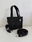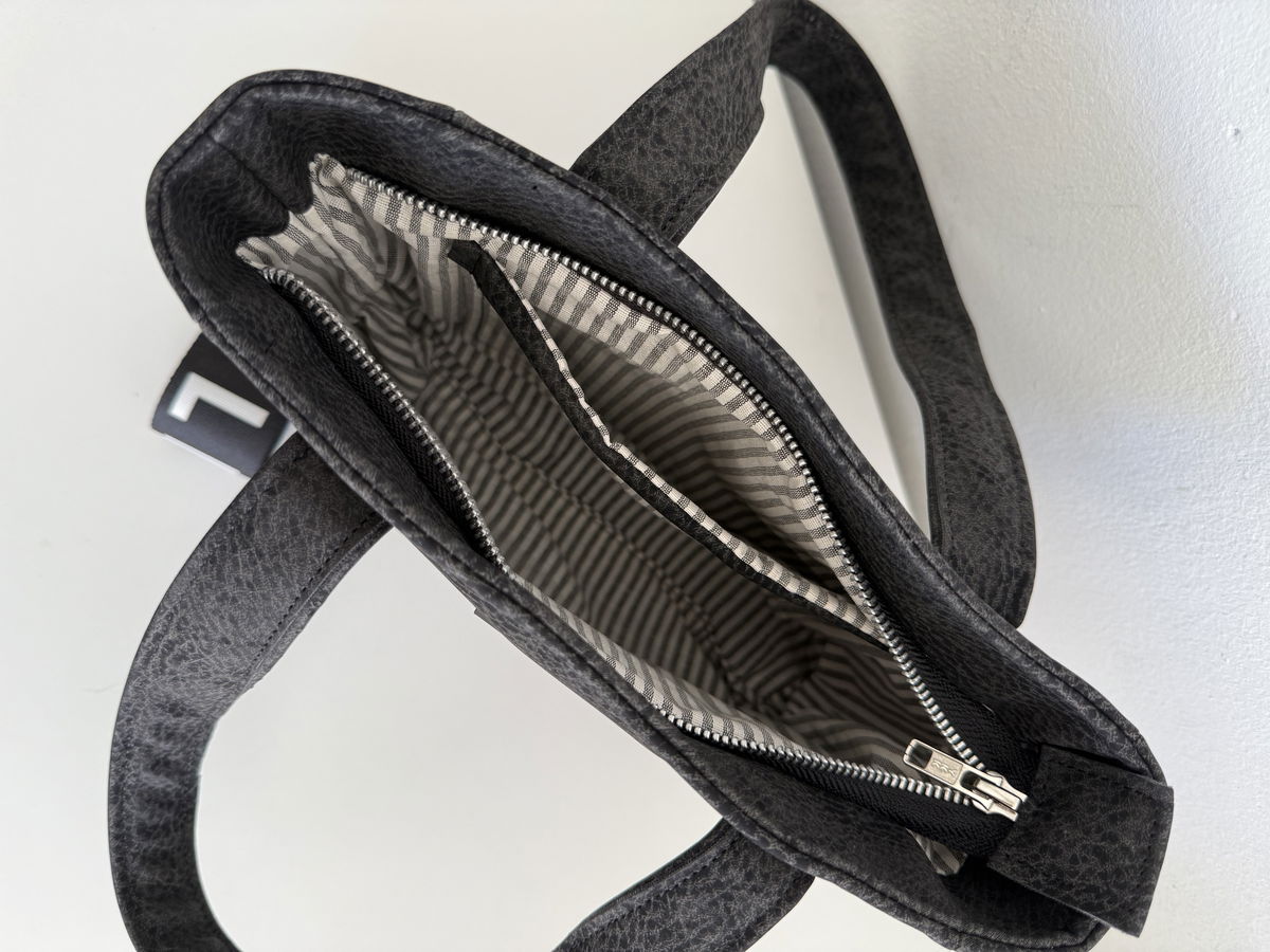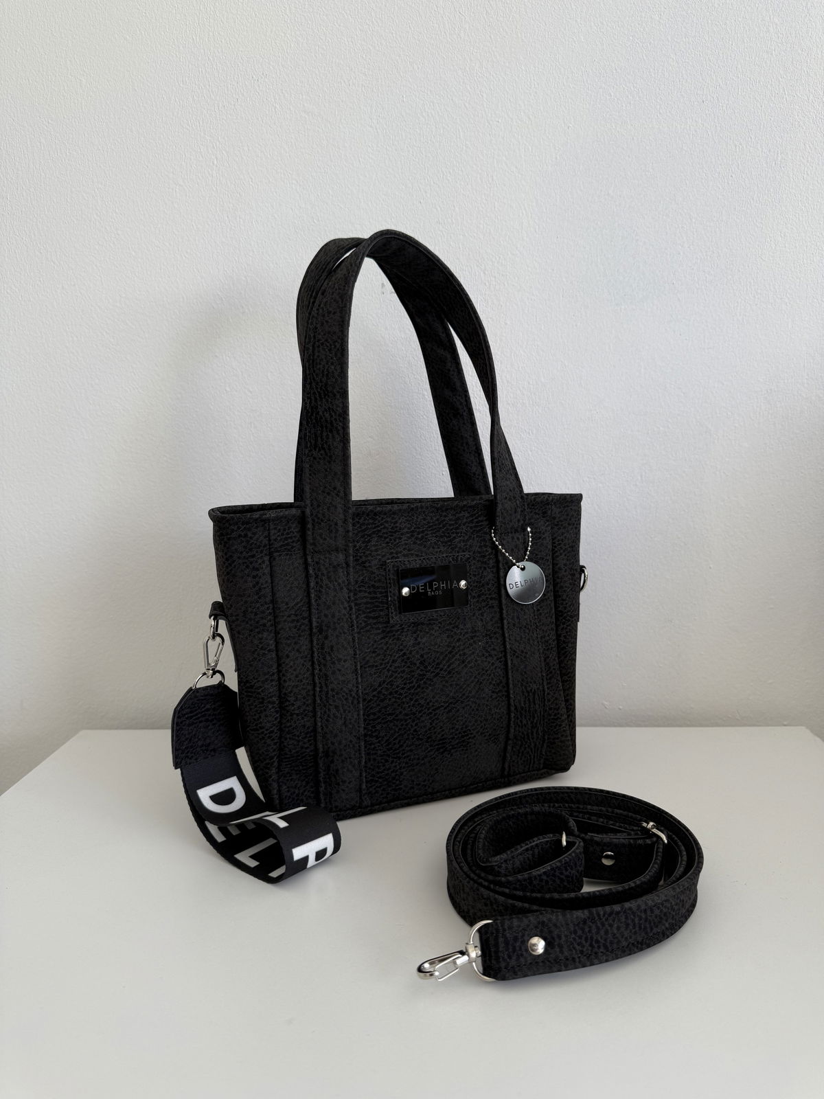 Mini tote negra gastado. Forrada en gross. Cuenta con bolsillo interno. Correa larga desmontable y regulable.